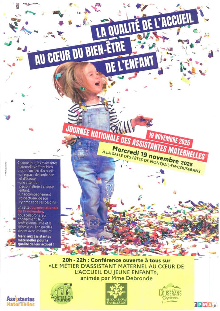 Le mercredi 19 novembre, à l’occasion de la Journée nationale des assistants maternels, les Relais Petite Enfance de la communauté de communes Couserans Pyrénées et la crèche familiale organisent une journée spéciale à la salle des fêtes de Montjoie-en-Couserans.