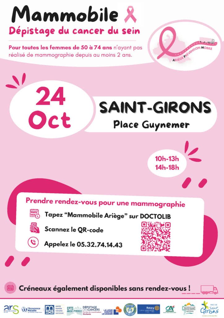 Mammobile le 24 oct à St-Girons Dépistage du sein le 24 octobre place Guynemer à St-Girons pour les femmes de 50 à 74 ans. Appelez le 05.32.74.14.43 ou tapez mammobile Ariège sur Doctolib. Créneaux également disponibles sans rendez-vous.